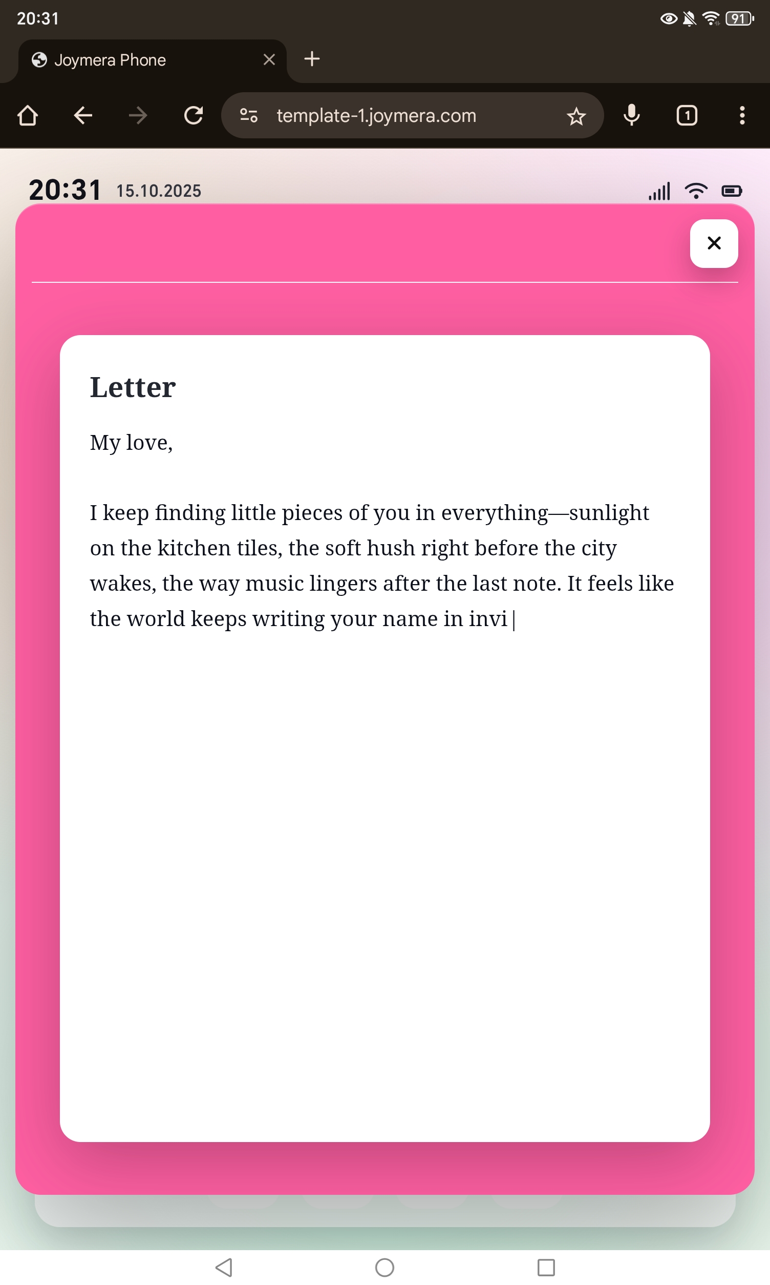 Every detail is crafted around your personality and style — from the typography to the transitions, from the flow of the story to the smallest animations. Whether it’s an anniversary, a birthday, or a surprise celebration, Joymera is the sweetest and most meaningful way to say “this is how I feel.”